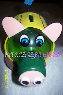 Nas minhas andanças na net ...como gosto muito de reciclagem...encontrei o modelo de um cofre de porquinho feito na garrafa de pet, a mini, e resolvi reproduzir um. Este foi feito com detalhes em EVA e tinta dimensional. A minha filhota já tratou de colocá-lo em uso fazendo seu pézinho de meia...ou melhor de porquinho rsrsrsrsrs
